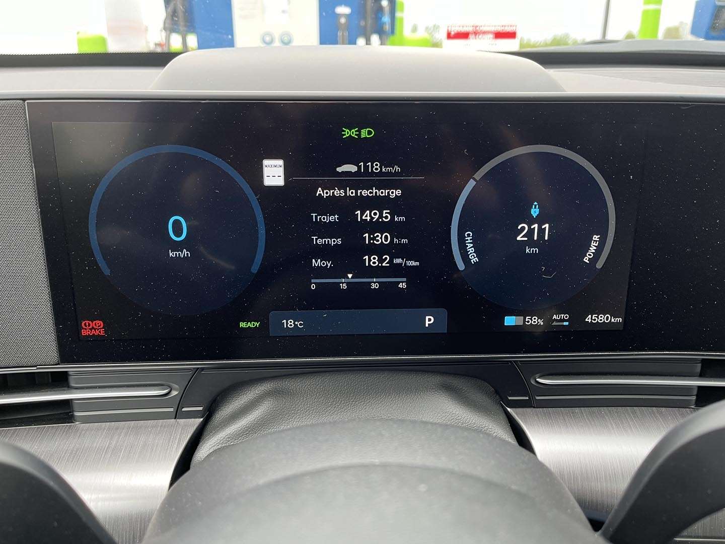 To our surprise, the average charging speed was higher at the less powerful charger! That charger delivered about 44kWh up to 80% capacity, while the 100kWh charger averaged 35kWh with a brief peak of 41 kWh. The second charge, which took 31min to go from 58 to 81%, casts doubt on Hyundai’s claimed ability to go from 10 to 80% in just 43min.