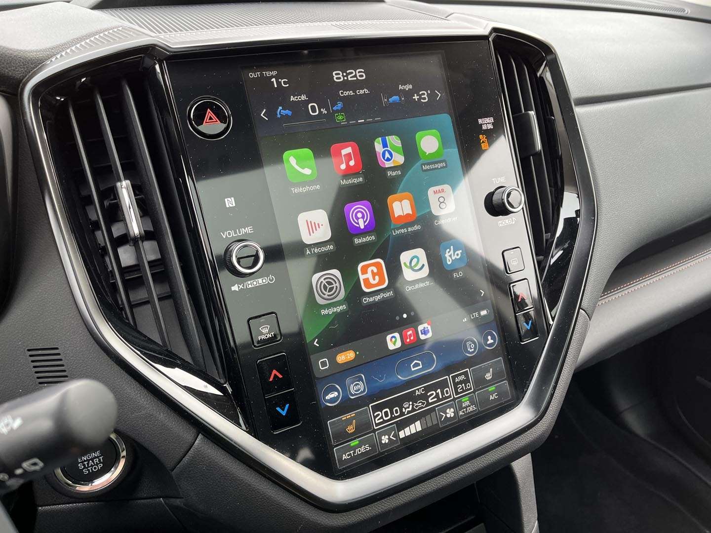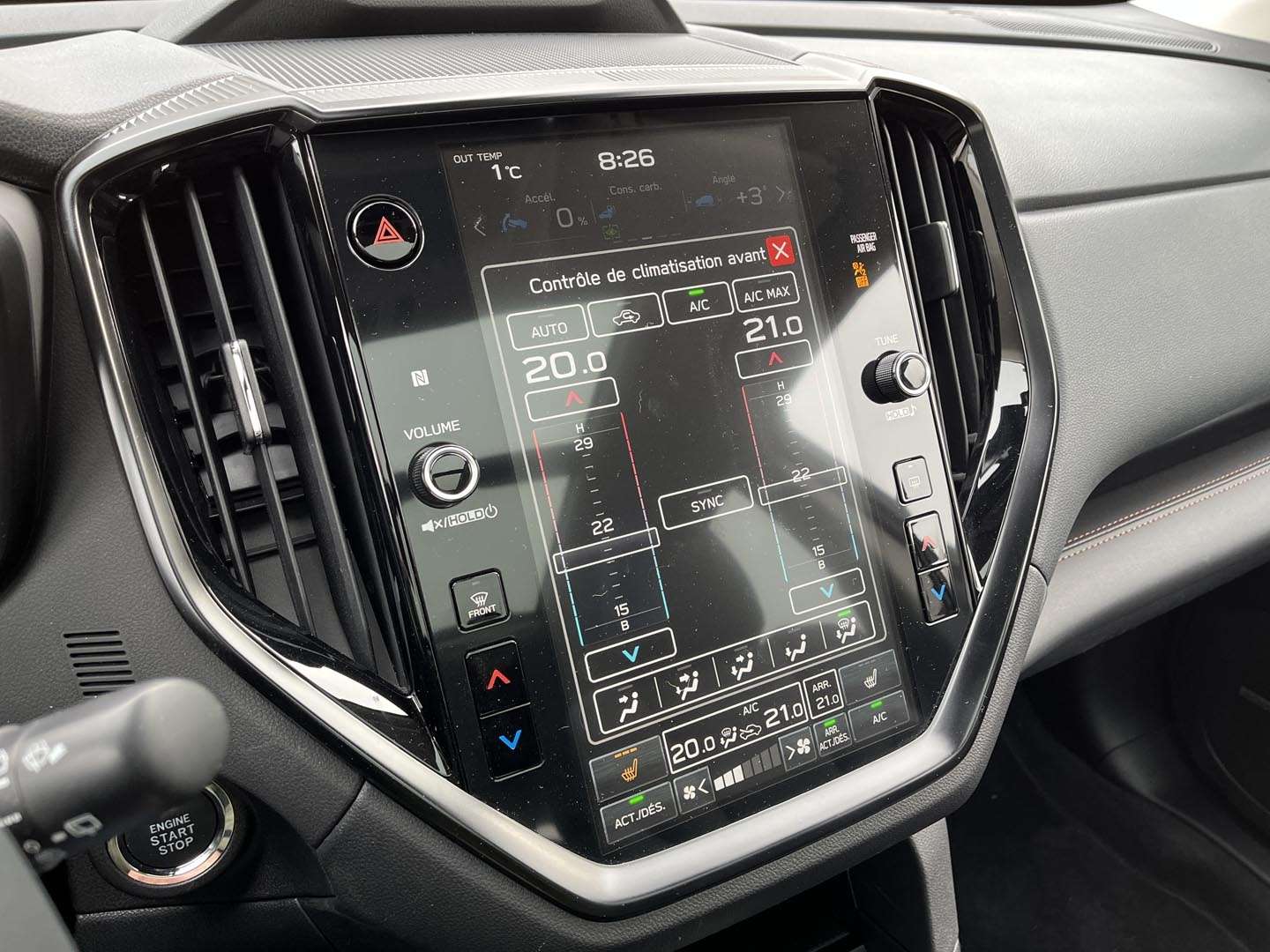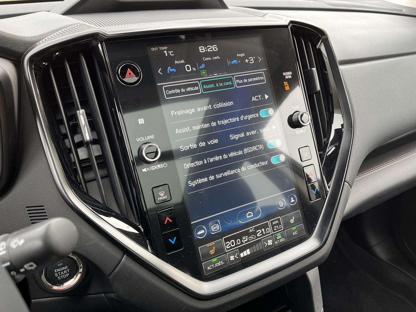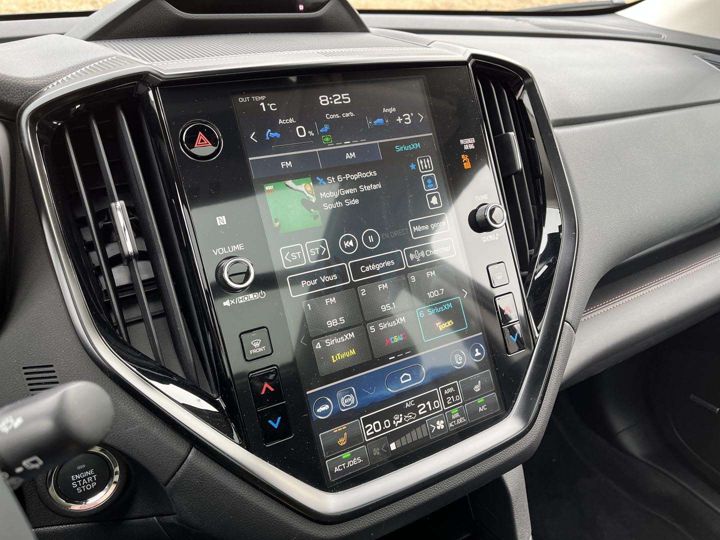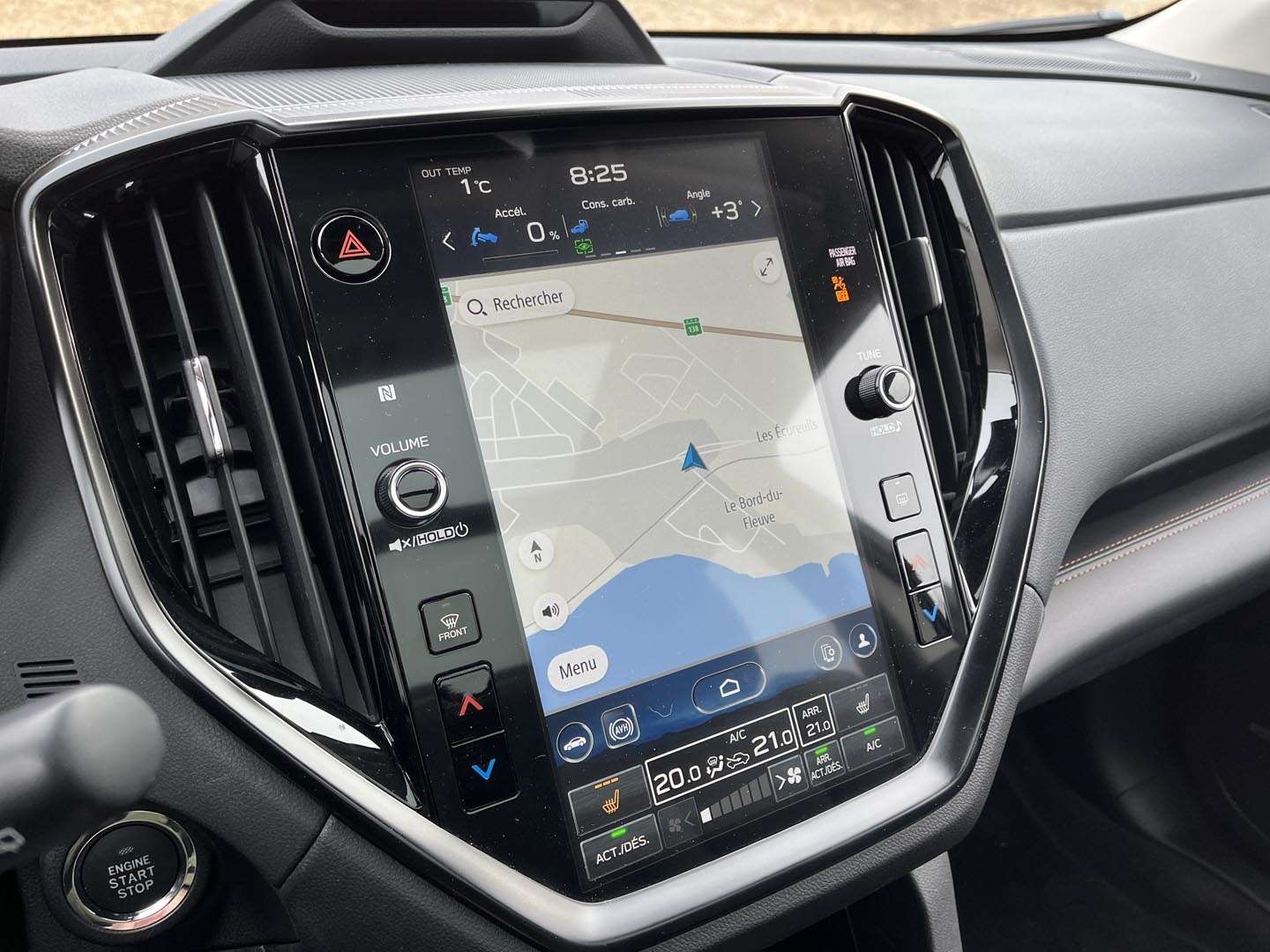 L’Ascent évite en grande partie ce piège: presque toutes les fonctions sont exactement là où on les attend, y compris le traditionnel levier de vitesses et un ordinateur de trajet flanqué d’une paire de cadrans analogiques parfaitement lisibles. Tant mieux, parce que là où Subaru a laissé le style l’emporter sur la forme, le résultat est mitigé. Nous parlons ici de l’écran tactile vertical de 11,6 pouces qui domine le tableau de bord. Malgré une mise à jour en 2023, trop de fonctions monopolisent encore l’attention du conducteur, dont celles de la ventilation, situées tout au bas de l’écran. La réaction demeure lente à l’occasion et le graphisme fait un peu bon marché.
