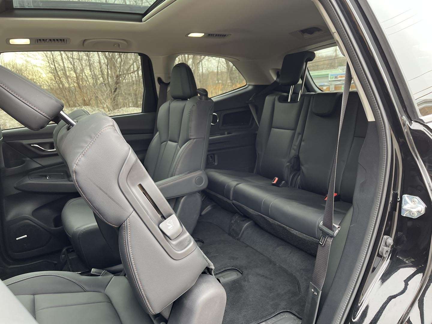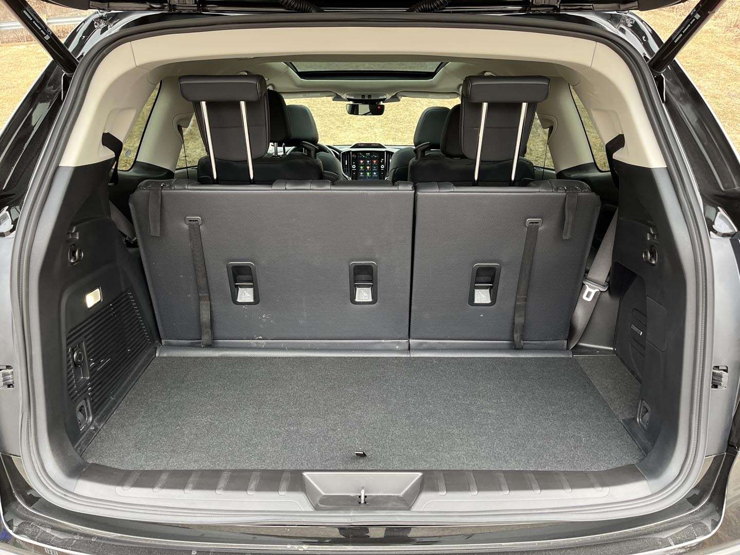Est-il réaliste d’installer trois occupants dans la troisième rangée? Pas vraiment, puisque les passages de roues restreignent la largeur de la banquette. En avançant les baquets de la seconde rangée, il est toutefois possible d’y accommoder deux adultes avec un dégagement honnête pour les jambes. Si on choisit plutôt de rabattre les dossiers des deux rangées arrière pour transporter de la marchandise, on obtient un plancher plat de 211cm (82 pouces), assez long pour y déposer une porte de chambre standard, par exemple.